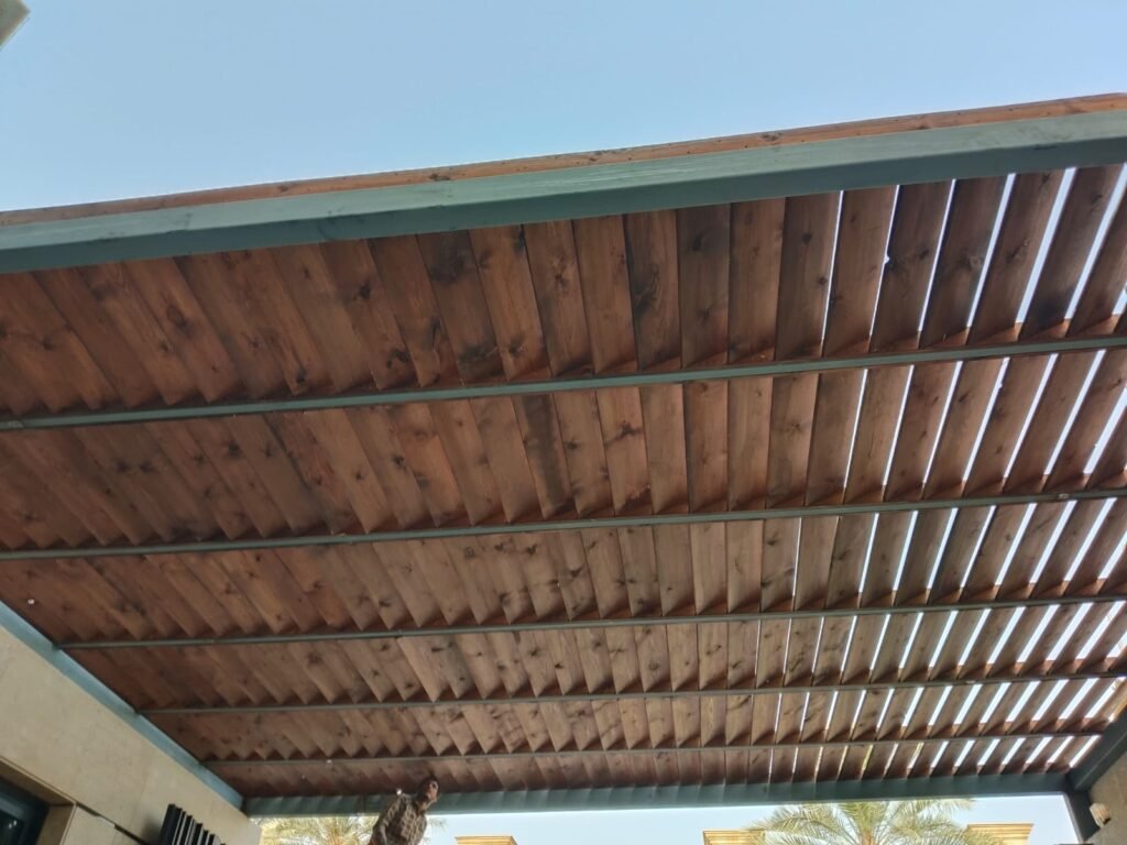 - المظلات الهجين: دمج الهيكل الحديدي مع سقف من شرائح الخشب أو اللكسان الشفاف.