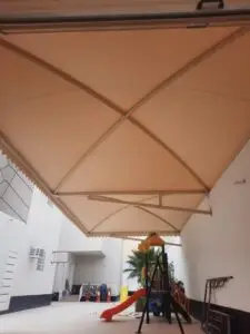 - تثبيت الغطاء: يتم وضع وتثبيت مادة التغطية (القماش، الألواح الخشبية، البولي كربونيت) بإحكام على الهيكل. يجب التأكد من ضبط قوة الشد في الأقمشة لتجنب الترهل.