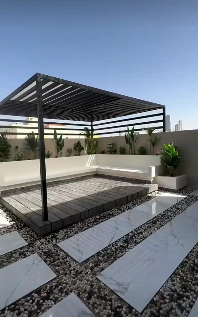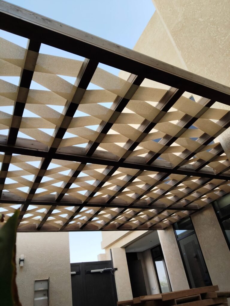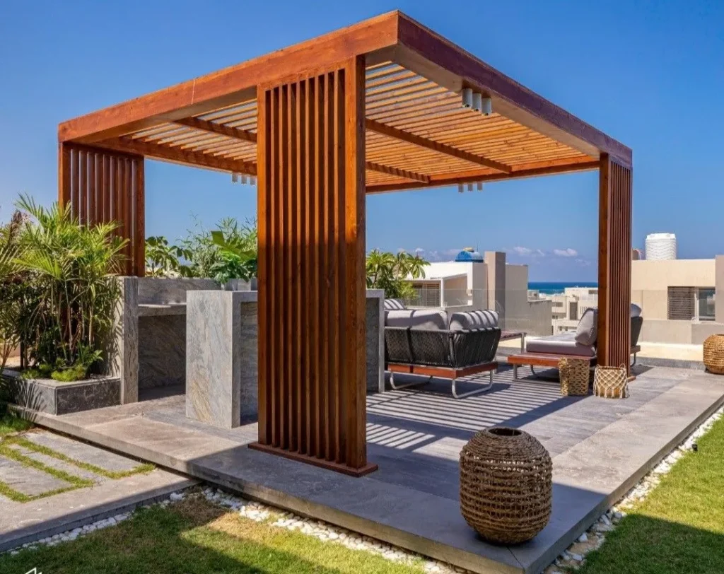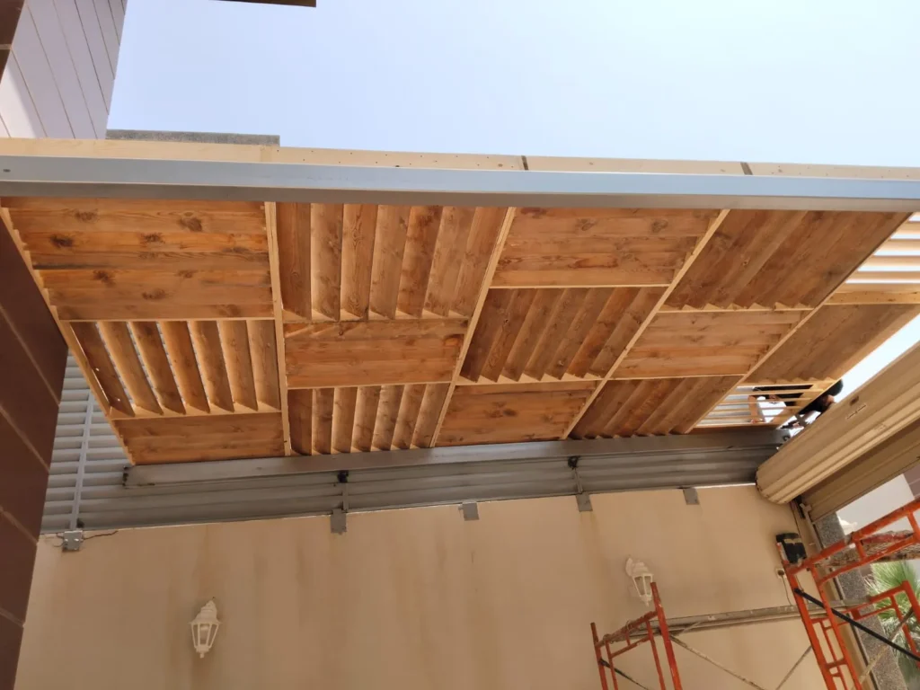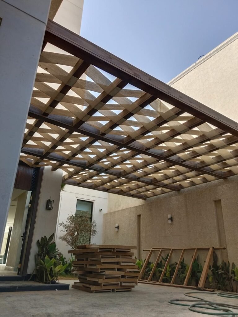 - البرجولات الخشبية: تتميز بالدفء والكلاسيكية، وتُصنع عادة من خشب “التيك” أو “السويدي” المعالج لمقاومة التسوس والرطوبة.