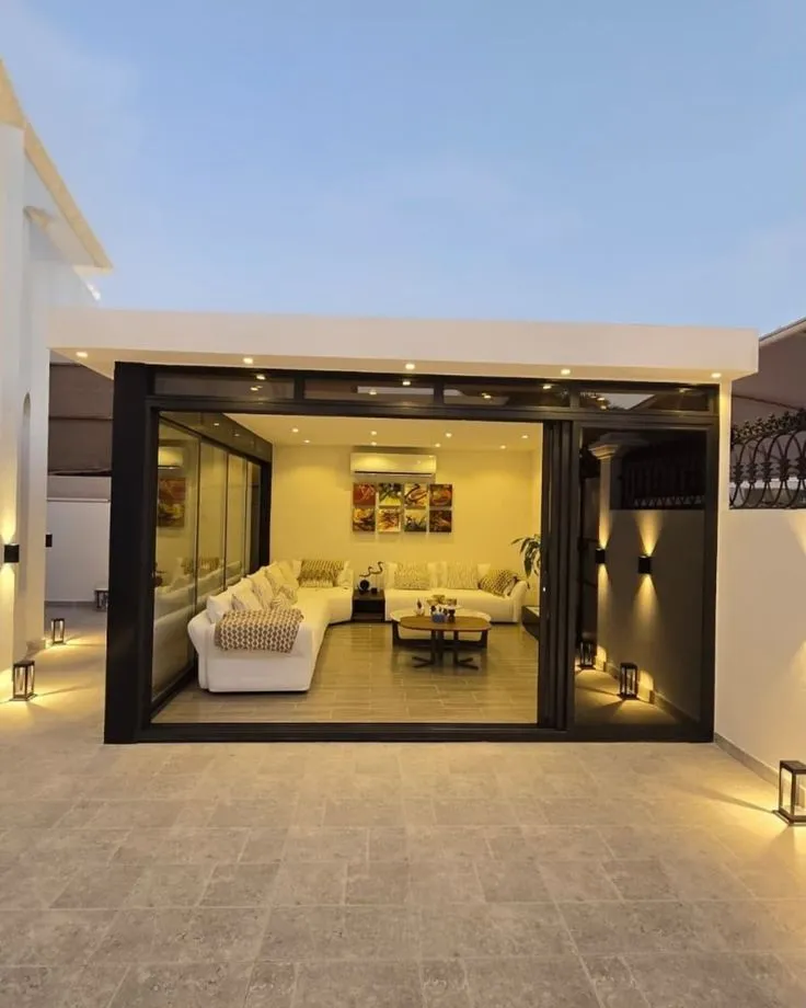 - المجالس المودرن: يتم دمج ألواح الساندوتش بنل مع واجهات زجاجية (استركشر) لإعطاء إطلالة بانورامية على الحديقة.