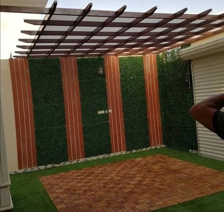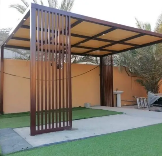 - البرجولات الخشبية: تضفي لمسة كلاسيكية دافئة، وتُصنع عادة من خشب السويدي أو التيك المعالج ضد التسوس والرطوبة.