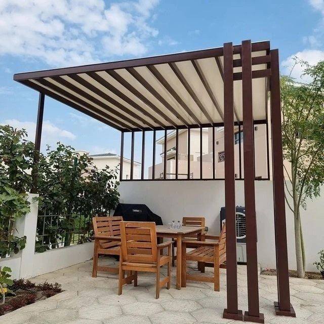 - برجولات حديدية دهان خشبي: تعطيك شكل الخشب الطبيعي مع صلابة الحديد وعمره الافتراضي الطويل.